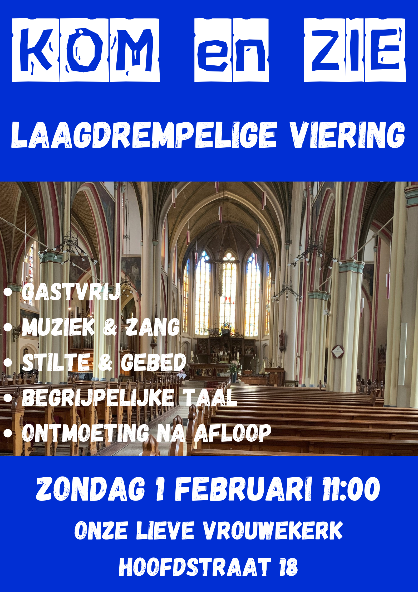 Op zondag 1 februari is er om 11.00 uur weer een Kom&Zie-Viering in de O.L.V. kerk in Apeldoorn. Dat is op zich een normale eucharistieviering, maar wel met uitleg om de viering toegankelijker te maken voor nieuwkomers. Ook is er een welkomst-team aanwezig om nieuwkomers te ontvangen. Onze trouwe parochianen worden uitgenodigd om geïnteresseerde vrienden of bekenden mee te nemen naar deze viering. Een ieder is van harte welkom!