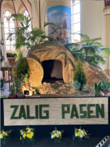 Om 15.00 uur is op 1e paasdag de kans om bij de Paasgrot in de Martinuskerk te Twello te komen luisteren naar het paasverhaal. Pastoor Henri zal dan een korte paasviering voor kinderen houden en na afloop gaan we samen eieren zoeken. De paasgrot is te bezichtigen tussen Pasen en Hemelvaart na iedere kerkdienst en op de zondagmiddagen tijden de ‘open deur’ tussen 14.00- 16.00 uur.