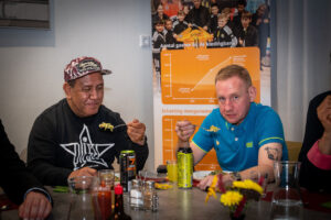 Rond 18 uur liep het restaurant vol: vrienden van de straat, senioren (90+), jonge stellen, directeuren, pastoor en wethouder. Een heel divers gezelschap dat doorgaans elkaar niet zomaar zal ontmoeten. Dankzij verschillende donateurs kon een groep vrienden van de straat, wekelijkse bezoekers van de Franciscustafel, uitgenodigd worden. Zij ontvingen een uitnodiging dat met liefde voor hen een stoel door een ander was betaald.