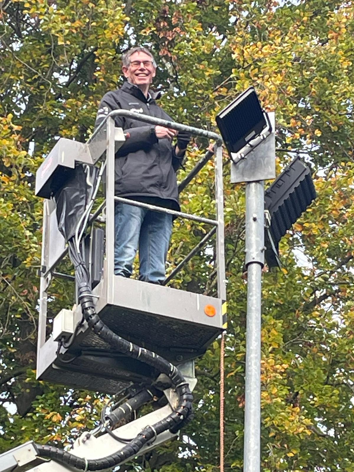 Afgelopen week zijn Louis en Gerard Maathuis in de weer geweest om nieuwe breedstralers te monteren rondom de St. Martinus kerk. De oude waren al een tijdje kapot en versleten, en dus aan vervanging toe. Met behulp van een hoogwerker en goed in de beveiliging gezet hebben onze mannen weer een mooie klus afgeleverd.
